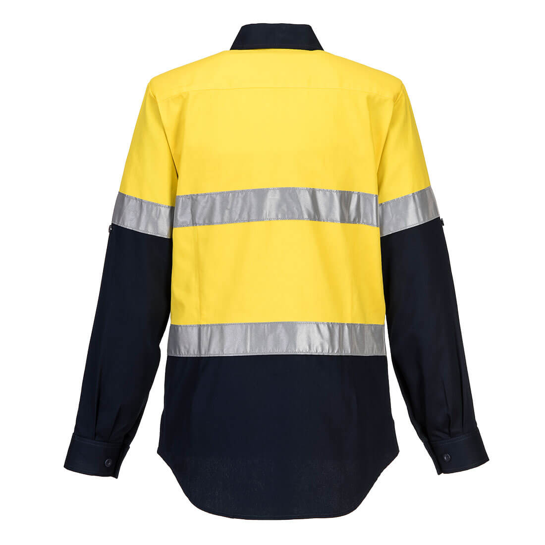 Women’s 2-Tone Hi-Vis Preshrunk 100% Regular Weight Long Sleeve Drill Shirt with Tape. Double-breasted pockets, both with pen division, plastic button closure, and Gusset Sleeves. Additional back and front darts for a better fit and roll-up sleeves. Reflective Tape around the body and arms.