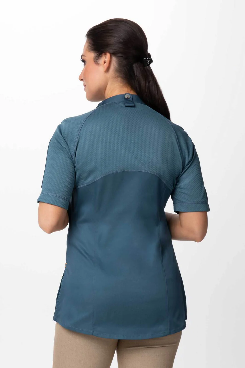 Feel revived and renewed wearing our Varkala Chef Jacket. Our raglan short-sleeve jacket features an off-set zipper front with a snap collar, a back collar apron tab to hold your apron strap in place, a left sleeve thermometer pocket, front chest concealed pockets, and side slits. Move with ease with knitted mesh sleeves and back curved yoke which are made with a recycled 4-way stretch fabric.