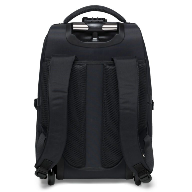 - Contoured padded mesh back panel can slip over wheeled bag handle